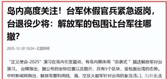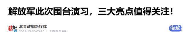 任何试图以卵击石的举动,最终只能加速那些分裂图谋化为齑粉的进程。 参考信源 环球网:《“正义使命-2025”演习举行实弹射击,专家:把台岛围个遍,解放军火力网全覆盖》发布时间:2025.12.30 北青政知新媒体:《解放军此次围台演习,三大亮点值得关注!》发布时间:2025.12.30 金羊网:《解放军演习后,台防务部门慌了:紧急召开记者会》发布时间:2025.12.29